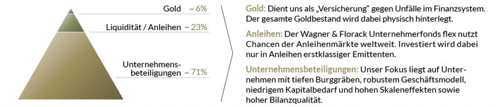Für diejenigen, die unsere Philosophie des langfristigen, unternehmerischen Investierens schätzen und die geringere Schwankungen ihres Kapitals als bei reinen Aktienfonds – selbst als beim Unternehmerfonds – bevorzugen und ihr Nervenkostüm nicht überbeanspruchen möchten, ist der Unternehmerfonds flex gedacht. Denn die langfristige Beteiligung an Weltklassefirmen wird im Unternehmerfonds flex ergänzt durch die Investition in Anleihen bester Bonität, Gold und Liquidität als Manövriermasse. So erreichen wir unser selbstgestecktes Ziel: Substanzielle Investitionssicherheit und attraktive Wertsteigerungen unter langfristigen Aspekten bei geringer / geringerer Schwankungsintensität.