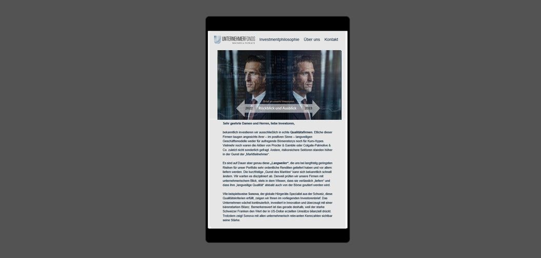 Kursschwankungen müssen wir dabei leider akzeptieren. Ich weiß, ein Jahr, wie das letzte, ist emotional herausfordernd. Für den einen mehr, für den anderen weniger. Es tut weh. Wer, wie wir, jedoch echte Qualität zu angemessenen Bewertungen im Portfolio und zudem Zeit und Disziplin hat, braucht sich in Phasen wie aktuell weiterhin keine Sorgen zu machen. Das bedeutet: Wer an Qualitätsunternehmen zu angemessenen Bewertungen beteiligt ist, sollte das auch tunlichst bleiben. Und diejenigen, die freie, langfristig zur Verfügung stehende Liquidität besitzen? Ich zähle mich nicht zu der Sorte, die die sich ergebenden Chancen sehr betonen. Aber sie sind eindeutig da. Natürlich: Die Kurse können wieder deutlich nachgeben. Die beschriebene Robustheit in Kombination mit der Tatsache, dass etliche Portfoliounternehmen günstig, teils sehr günstig bewertet sind, sind aber ein sehr guter Nährboden für einen langfristig großen Investmenterfolg. Deshalb ist es ratsam, Liquidität nach und nach in kleinen Schritten in die Unternehmerfonds oder allenthalben in andere Fonds, sich aber ausschließlich auf echte Qualität zu angemessenen Preisen fokussieren, zu investieren. Und wer ein Investment in einen reinen Qualitäts-Aktien-Fonds scheut, dem sei unser – ebenfalls aus unternehmerischer Sicht gemanagter – Unternehmerfonds flex ans Herz gelegt.
