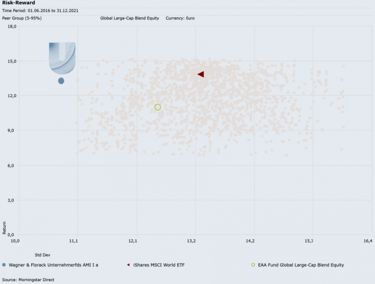 Die Netto-Wertentwicklung unseres Unternehmerfonds beträgt 25,9% (I-Anteilsklasse) in 2021. Die nachstehende Tabelle zeigt die kumulierten und annualisierten Performancezahlen über verschiedene Zeiträume sowie einige Kennzahlen, auch im Vergleich zu unserer Morningstar-Vergleichsgruppe „Global Large Cap Blend Equity“.