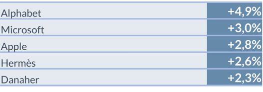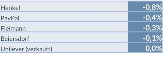 Zu den Firmen, die überdurchschnittlich zugelegt haben, zählen auch z. B. unsere großen Portfoliopositionen Nestlé und Procter & Gamble, die jeweils einen Zuwachs von ca. 30% in EUR erzielten und einen Performance-Beitrag von 2,0% und 1,9% leisteten.