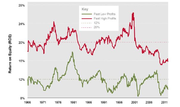 Die 1000 größten Unternehmen in den USA wurden für jeden Punkt des Diagramms in Quartile sortiert, basierend auf der Eigenkapitalrendite (ROE). „Past Low Profits“ besteht aus den Unternehmen im Quartil mit der niedrigsten ROE. Zu den „Past High Profits“ gehören die Unternehmen im Quartil mit der höchsten Eigenkapitalrendite.