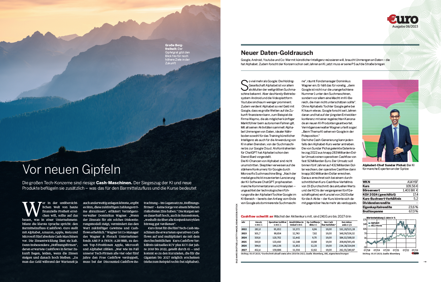 Das Wirtschafts- und Kapitalmarktmagazin €uro in der aktuellen Ausgabe zum Thema „KI“ und Apple, Alphabet Inc., Microsoft sowie Meta mit Statements von Dominikus Wagner.