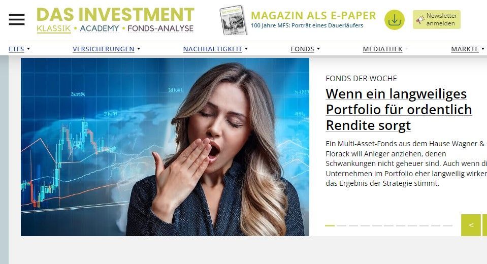 Ordentliche Rendite: „Das Investment“ porträtiert den Wagner & Florack Unternehmerfonds flex als „Fonds der Woche“ und zeigt, wie man „langweilig“ Performance generieren kann: Mit einem ausschließlichen Fokus auf Qualität bei Aktien und Anleihen und Geduld: Dominikus Wagner und Dirk Schmitt investieren, den Marktgegebenheiten angemessen, flexibel. Dabei steuern sie das Portfolio mit ruhiger Hand statt es hektisch-erratisch anzupassen.