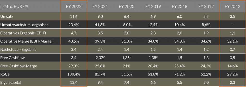 Schaut man sich den aussagekräftigeren 4-Jahreszeitraum von 2019 (also dem Jahr vor Corona im „eingeschwungenen“ Geschäftszustand) bis 2022 an, so beträgt die durchschnittliche jährliche Wachstumsrate des organischen Umsatzwachstums 6,2% (kumuliert 27,2%). Im 10-Jahreszeitraum von 2013 bis 2022 beträgt sie 9,4% (kumuliert +145,8%).