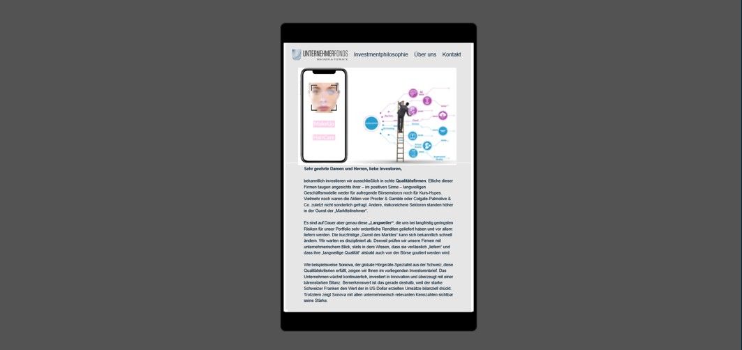im ersten Quartal 2024 verzeichnete der Unternehmerfonds eine Wertsteigerung von 4,8% (Anteilsklasse I). Unser Multi Asset Fonds Unternehmerfonds flex legte um 3,4% zu (Anteilsklasse C). Die positive Wertentwicklung beider Unternehmerfonds ist breit abgestützt.