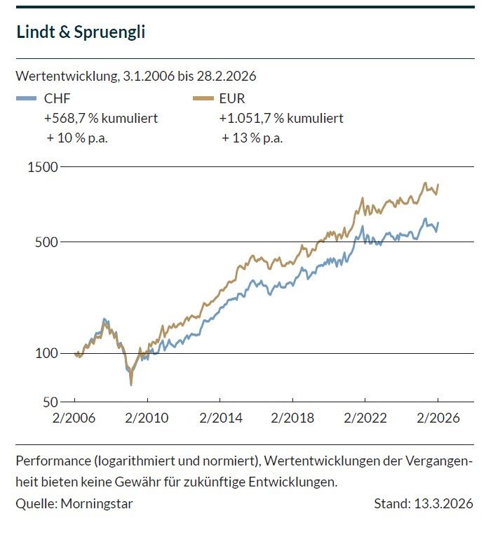 Während der weltweite Schokoladenmarkt insgesamt nur moderat wächst, legt Lindt seit Jahren deutlich dynamischer zu und hängt damit auch Volumenmarken wie Ferrero oder Mondelez (Milka) ab. Im vergangenen Jahr wuchs der Umsatz organisch um 12,4 % auf 5,92 Mrd. CHF. Zur Einordnung: Langfristig strebt Lindt & Sprüngli ein Wachstumsziel zwischen 6 und 8 % an. Auf allen Absatzmärkten hat Lindt 2025 deutlich zugelegt: Europa, Lindts größter Absatzmarkt, wuchs um 15,3 % auf 2,96 Mrd. CHF. Alle Einzelmärkte konnten den Umsatz zweistellig steigern, von +11,6 % in Italien bis +34,9 % in Benelux. Nordamerika legte 8,9 % auf 2,18 Mrd. CHF zu und der „Rest der Welt“ um 11,7 % auf 776 Mio. CHF.