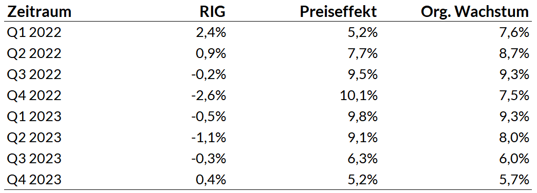 In Q4 hatte Nestlé die Preise noch einmal um 5,2% erhöht. Dennoch verbesserte sich das RIG nach -0,3% in Q3 auf +0,4% in Q4. Das RIG hat also wieder in den positiven Bereich gedreht. Und zwar spürbar. Nach vorne sollen Absatz und Produktmix nun wieder die Hauptquellen des Umsatzwachstums sein.