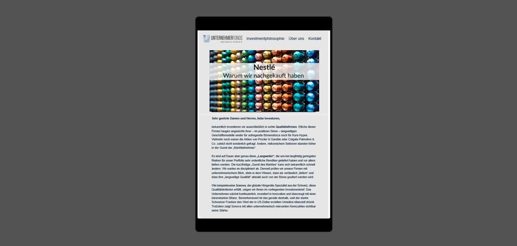 Nestlé: Sehr ordentliche Unternehmenswertentwicklung bei minimalem Geschäftsrisiko Behutsame Nachkäufe in den Unternehmerfonds in den letzten Wochen