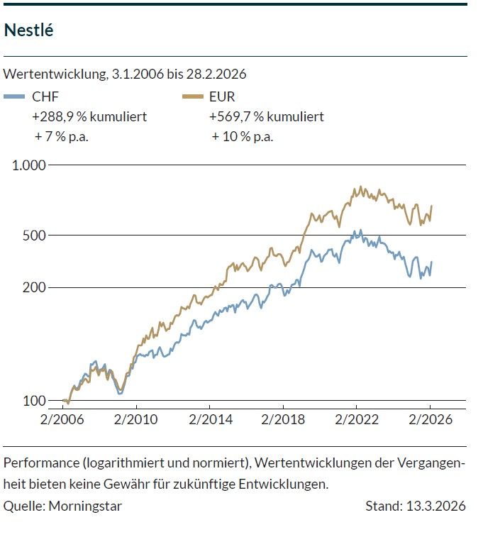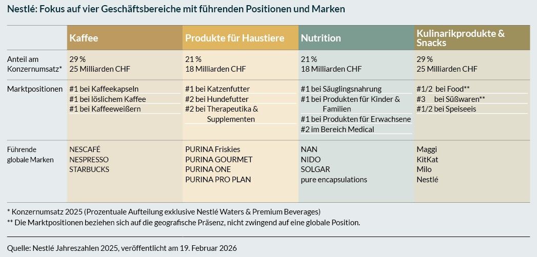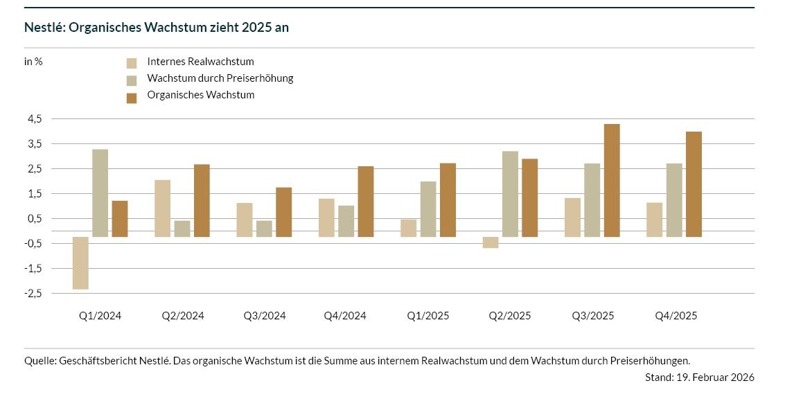 Erfreulicherweise konnte Nestlé die Kosteneinsparungen, die im Rahmen des Wachstumsplans Fuel for Growth mit 0,7 Mrd. CHF im Jahr 2025 veranschlagt waren, mit 1,1 Mrd. CHF deutlich übertreffen. Diese Einsparungen kommen on top zu einer weiteren Milliarde an Einsparungen aus den laufenden Effizienzinitiativen von Nestlé hinzu. Diese positive Entwicklung nimmt Navratil zum Anlass, das angestrebte Einsparpotenzial mit 2 Mrd. CHF für 2026 noch etwas ambitionierter festzulegen als ursprünglich mit 1,4 Mrd. CHF geplant. 2027 bzw. 2028 sollen sich die Einsparungen dann auf 2,8 bzw. 3 Mrd. CHF belaufen.