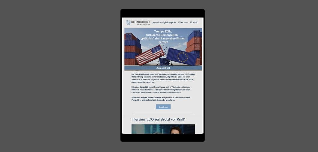 Die Welt verändert sich rasant, das Tempo kann schwindelig machen. US-Präsident Donald Trump schürt mit seiner erratischen Zollpolitik die Sorge vor einer Rezession in den USA. Mit seiner Geopolitik zwingt Trump Europa, sich in Windeseile politisch und militärisch neu aufzustellen. Angesichts dieser und anderer Unwägbarkeiten schwankt die Börse, Anleger schichten massiv um. Wir analysieren das Geschehen aus der Perspektive unternehmerisch denkender Investoren – und bewahren die Ruhe.