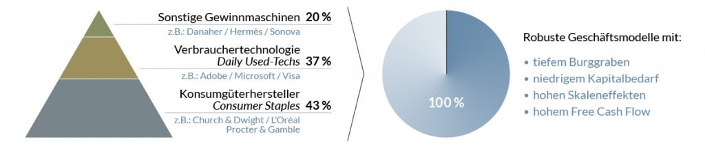 Wir wissen es sehr wohl zu schätzen, uns mit den Unternehmerfonds an robusten Gewinnmaschinen wie Adobe, Apple, Danaher, Google und Visa beteiligen zu können: Firmen, die ihren unternehmerischen Gewinn, also den Free Cash Flow, binnen weniger Jahre verdoppeln. Da mittel- bis langfristig die Entwicklung des Unternehmensgewinns den Unternehmenswert determiniert, streben die Aktienkurse solcher Firmen im Laufe der Zeit immer weiter nach Norden, was langfristigen Miteigentümern das Portemonnaie zuverlässig sehr stark füllt. Darin unterscheiden sich unsere Portfoliounternehmen von den zahllosen kapitalintensiven, schwachmargigen und verschuldeten Firmen, deren Kurse über Jahre hinweg nicht vom Fleck kommen oder gen Süden driften – bei hohen Risiken. Wären wir alleine auf Renditemaximierung aus, müssten wir ausschließlich in solche Daily Used-Technologiefirmen wie Apple und Microsoft investieren oder in stark wachsende und hochprofitable Ausnahmefirmen wie Danaher oder Hermès.