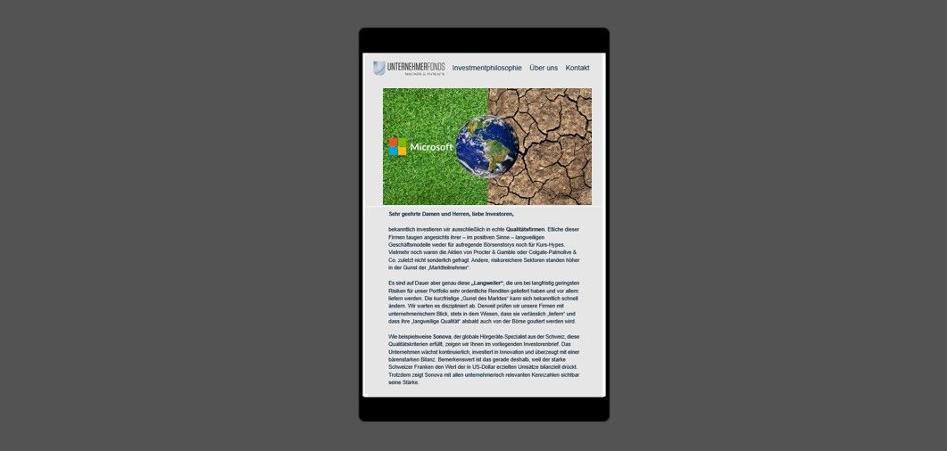 Wir sind daher fest davon überzeugt: Weltklassefirmen brauchen kein Weltbild, sondern eine fortlaufende aktive Kontrolle des Geschäftsmodells. Elementarer Bestandteil dieser Kontrolle ist dabei für uns auch die Frage der Veränderungsfähigkeit und Veränderungswilligkeit von Unternehmen. Die aktive Kontrolle ist aus unserer Sicht die originäre Hausaufgabe des Investors. Darauf liegt bei den Unternehmerfonds unser Hauptaugenmerk.